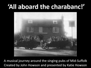 All Aboard the Charabanc is the latest talk on this topic, a fun presentation which takes the form of a virtual coach tour, visiting the traditional music pubs of Mid-Suffolk and hearing singers and musicians from those locations. Suitable for local history groups, WI etc. Fully illustrated with slides, recordings and live music if desired. Other talks on the subject can also be customised according to location or audience, all based on 40 years of collecting and playing folk songs and music from the eastern counties. Fully illustrated with slides, recordings and live music if desired.
