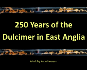 Designed to coincide with the relaunch of the website East Anglian Dulcimers which is dedicated to the history of this instrument in the region. A version of this talk was given to an international audience at the World Dulcimer Congress in 2015 and it was then presented for the English Folk Dance & Song Society as one of the Vaughan Williams Memorial Library lectures, More recently, it has been presented at Sidmouth Folk Festival, the English Country Music Weekend and the East Anglian Traditional Music Day. Fully illustrated with slides, recordings and historic instruments.